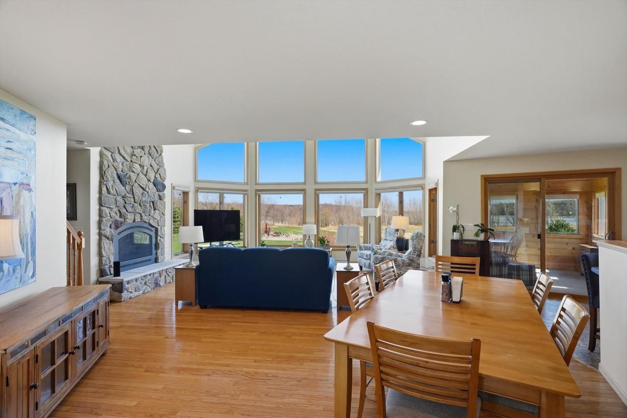 NO SHOWINGS UNTIL 4/28/26. STUNNING VIEWS set the stage at this beautifully maintained 4 BR, 2.5 BA Gene Hill custom-built home, perfectly situated on 2.45 acres with 160 feet of shoreline on the Eau Pleine Reservoir. From the moment you step inside, you're greeted by a dramatic floor-to-ceiling window wall that floods the home with natural light and frames the water beyond. Hardwood floors lead you into the open-concept kitchen, dinette, and living room, designed for both everyday living and effortless entertaining. The kitchen offers Corian countertops, backsplash, all appliances, and an eat-at peninsula that invites gathering. Just off the dinette, the 3-season porch is the perfect spot for summer dinners, but the true standout is the recently added composite deck, creating an ideal outdoor space to entertain, relax, and take in the peaceful surroundings. The living room is warm and inviting with a gas fireplace, while still capturing panoramic views of nature in every season. The loft offers flexibility as a home office or a cozy den, with incredible water views. The oversized